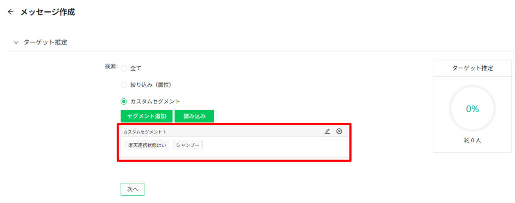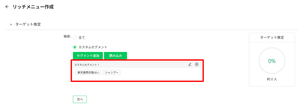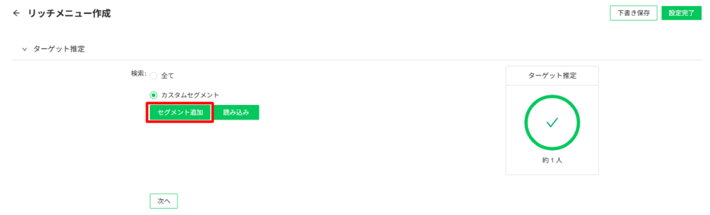 (1)各種登録 > リッチメニューから新規作成や編集をする際に、ターゲット推定の項目にて「セグメント追加」をクリックします。