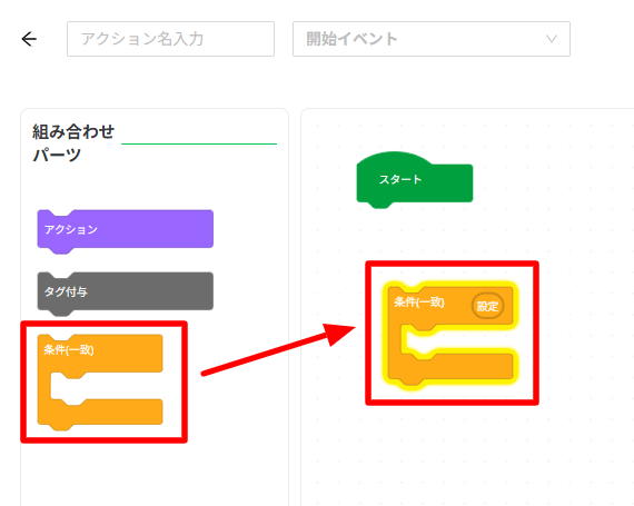 (1)各種登録 > トリガーアクションから新規作成や編集をする際に、組み合わせパーツから条件(一致)パーツを右のスペースにスライドします。