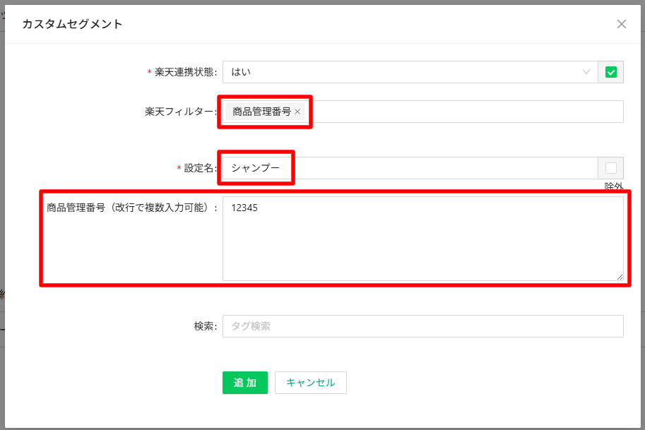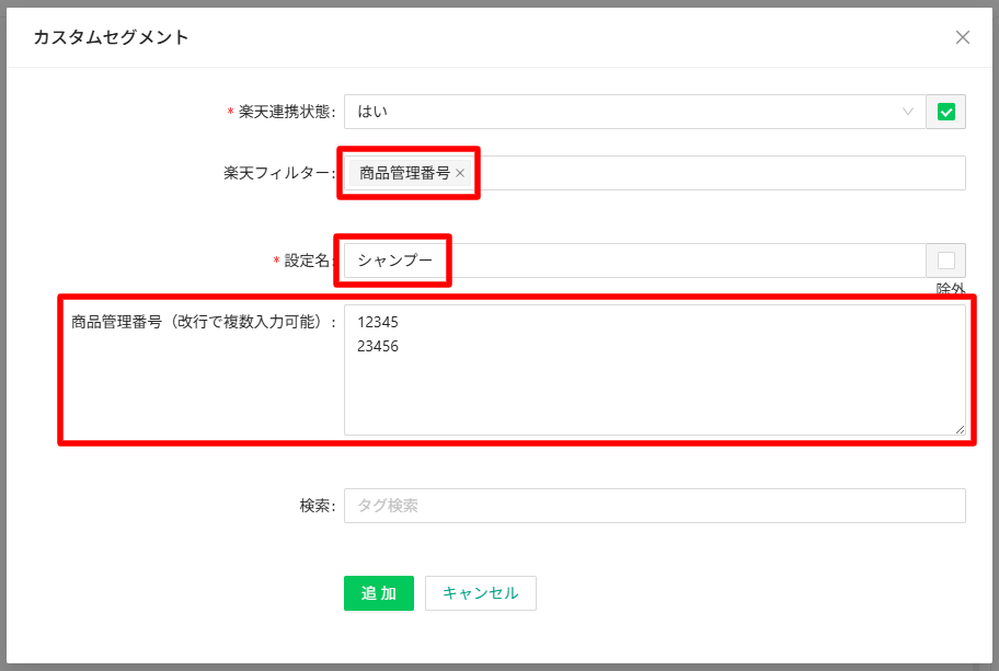 (3)その後、楽天フィルターの項目で「商品管理番号」を選択。設定名と商品管理番号を下記の項目へそれぞれ入力し、追加ボタンをクリックします。