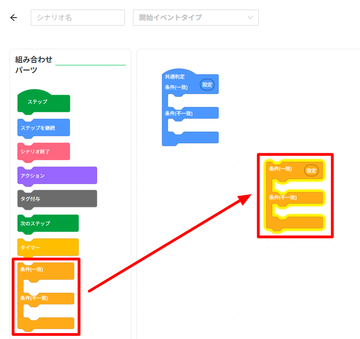 各種登録 > シナリオ配信から新規作成や編集をする際に、組み合わせパーツから条件(一致or不一致)パーツを右のスペースにスライドします。