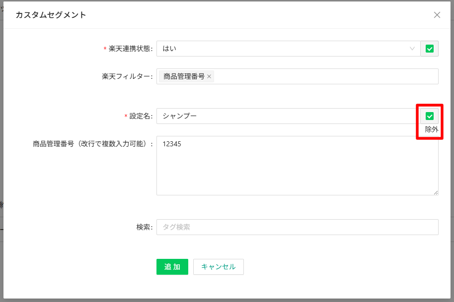 (4)また、除外にチェックを入れると、指定した商品管理番号以外の購入者に対してのセグメント設定が可能となります。