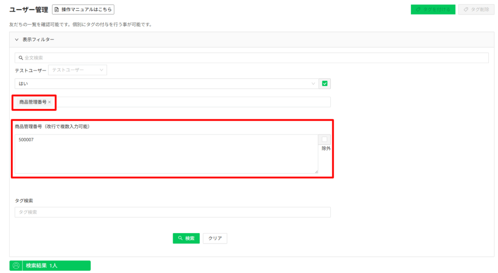 (2)その後、楽天フィルターの項目で「商品管理番号」を選択。下記に表示される項目へ商品管理番号を入力し、検索することで、該当する商品を購入したユーザーを調べることが可能です。
