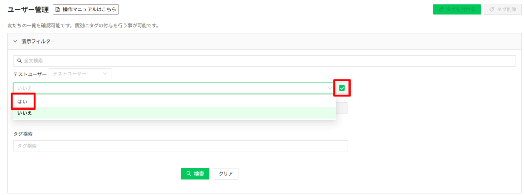 (1)ユーザー管理画面の表示フィルターから、楽天連携状態にチェックを入れ、「はい」を選択します。