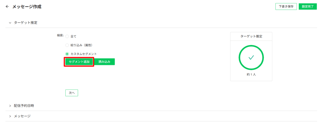 (1)配信管理 > 配信のメニューから新規作成や編集をする際に、ターゲット推定の項目にて「セグメント追加」をクリックします。