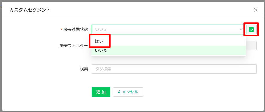 (2)楽天連携状態の項目にチェックを入れ、「はい」を選択します。